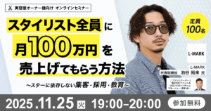 お客さまの声を最先端の分析でファン増加につなげる企業、株式会社ファンくる(本社:東京都千代田区、代表取締役社長:山口敬人)は株式会社 L-MARK(本社:大阪府寝屋川市、代表取締役:池谷 拓未)の池谷氏をお迎えし、「スタイリスト全員に月100万円を売上げてもらう方法 ~スターに依存しない集客・採用・教育~」 (定員:100名/無料)を11月25日(火)に開催いたします。(申し込み先:https://biz.fancrew.jp/seminar20251125_contact?=pr)