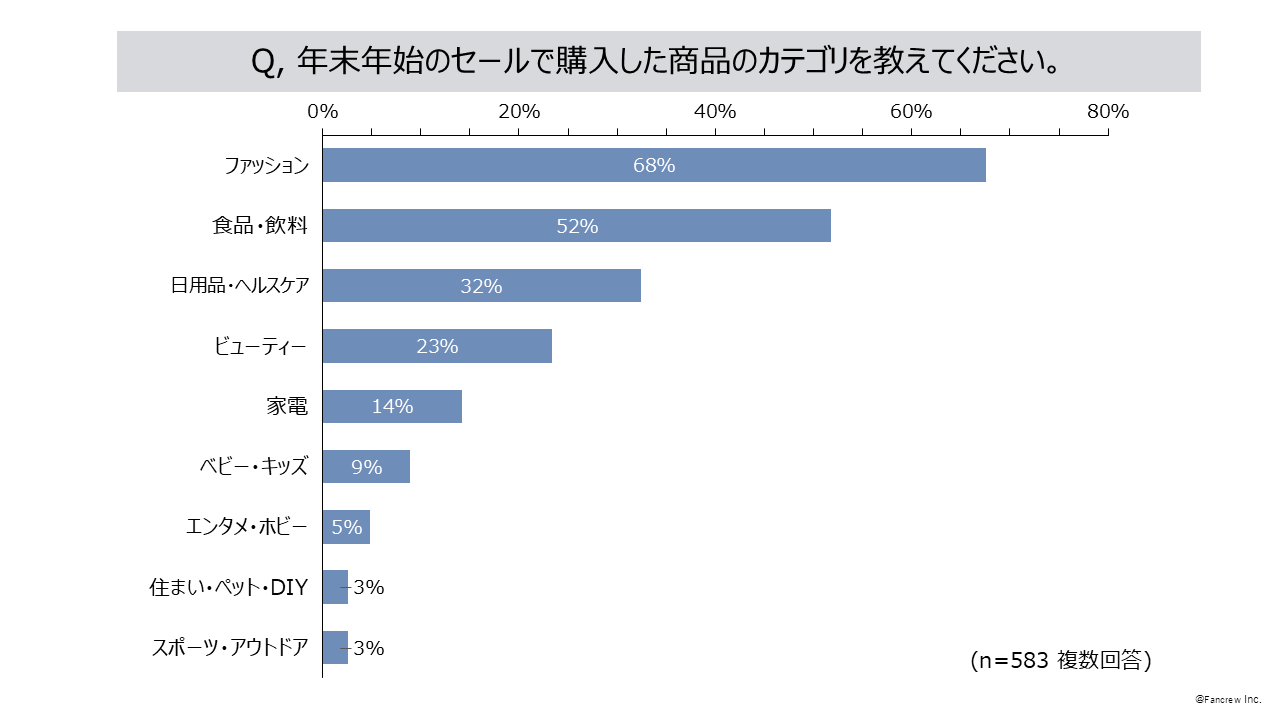 - 年末年始のセールで購入したのは「割引率が高いもの」「普段から購入しているもの」、「ファッション」関連の商品を購入