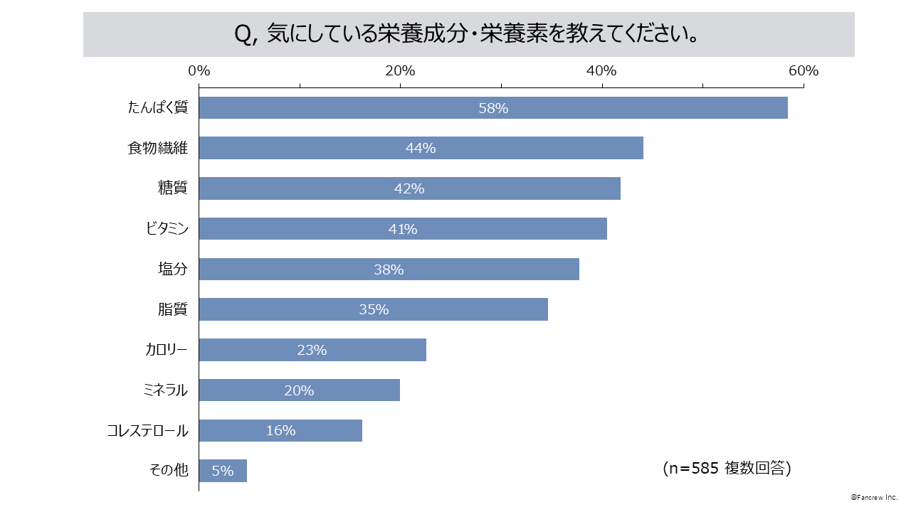 - 普段の食生活で気にしている栄養素は「たんぱく質」58%、「食物繊維」44%