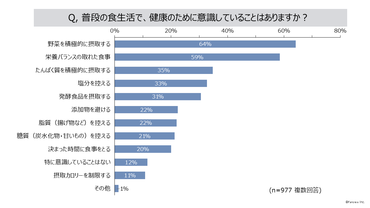 お客さまの声を最先端の分析でファン増加につなげる企業、株式会社ファンくる(本社:東京都千代田区、代表取締役社長:山口敬人)は、「ファンくる」会員を対象に、定期的に消費者の意識調査を実施しています。今回は普段の食生活について、健康のために意識していることや、特に気にしている栄養素などを「ファンくる」会員977名(男性206名、女性771名)に調査を実施しました。