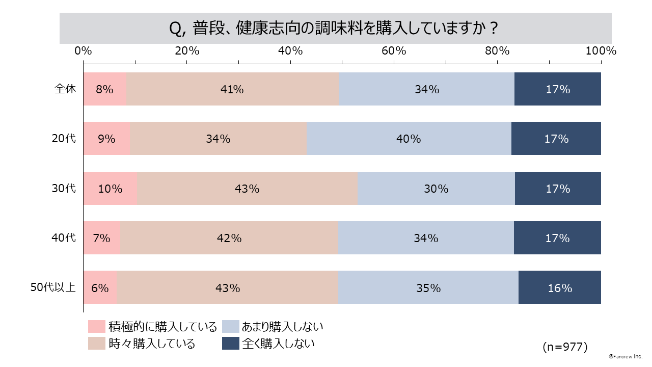 お客さまの声を最先端の分析でファン増加につなげる企業、株式会社ファンくる(本社:東京都千代田区、代表取締役社長:山口敬人)は、「ファンくる」会員を対象に、定期的に消費者の意識調査を実施しています。今回は健康志向の調味料の購入について、普段、健康志向の調味料を購入している方の割合や、主な購入場所などを「ファンくる」会員977名(男性206名、女性771名)に調査を実施しました。