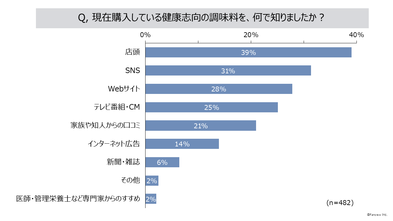- 現在購入している健康志向の調味料を知ったきっかけは「店頭」39%、「SNS」31%