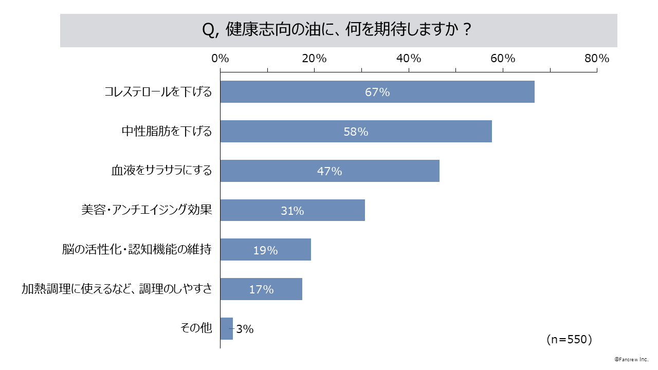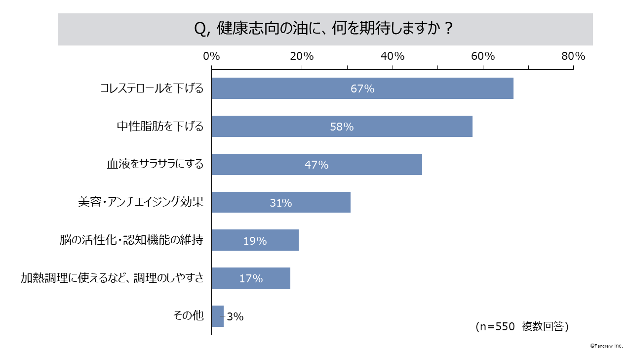 - 健康志向の油に期待することは「コレストロールを下げる」67%、「中性脂肪を下げる」58%