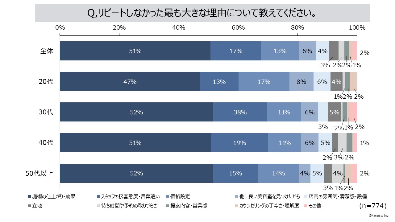 2. リピートしなかった最大の理由は「施術の仕上がり・効果」が51%で最多。残りの約半数は「技術以外」の要因