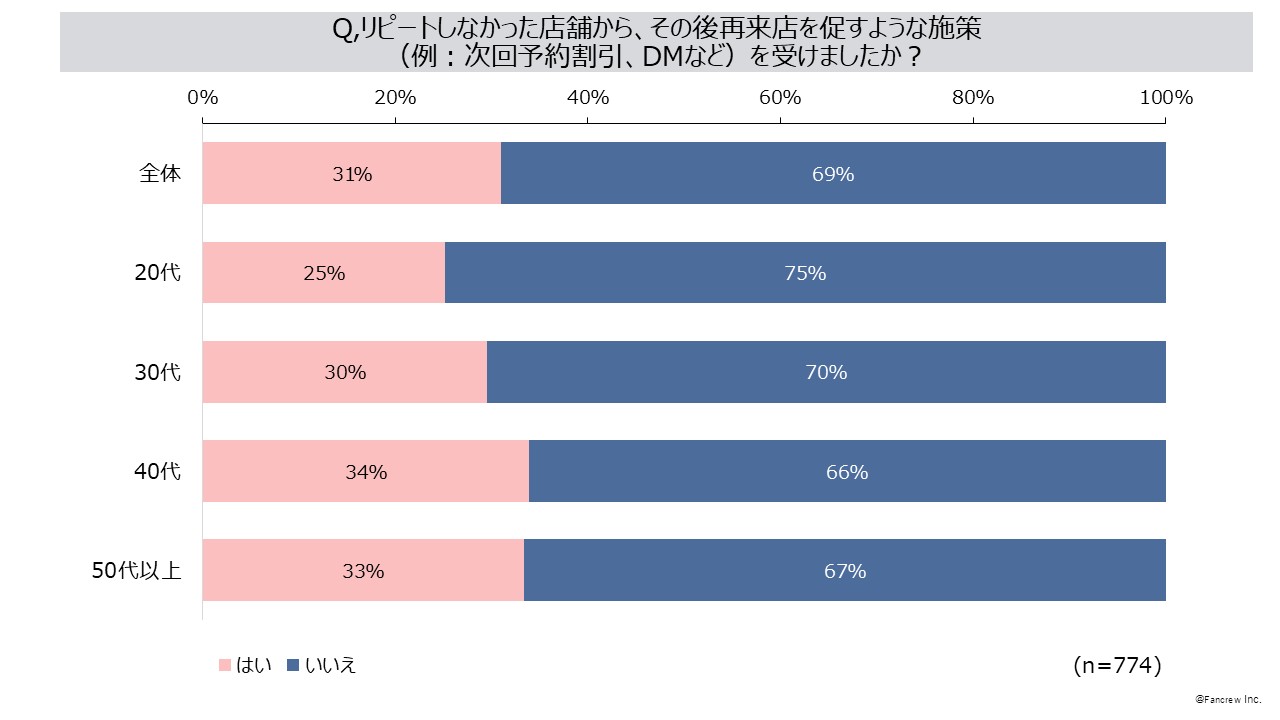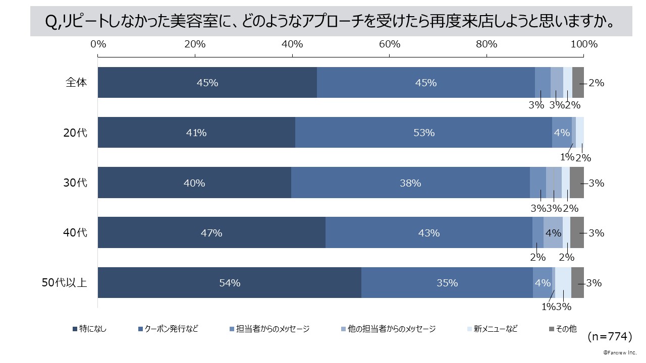 - 約7割が再来店を促す施策は行っていない。クーポンなどで再来店のきっかけを作り、「スタッフへの信頼」を再構築することでリピーターへ