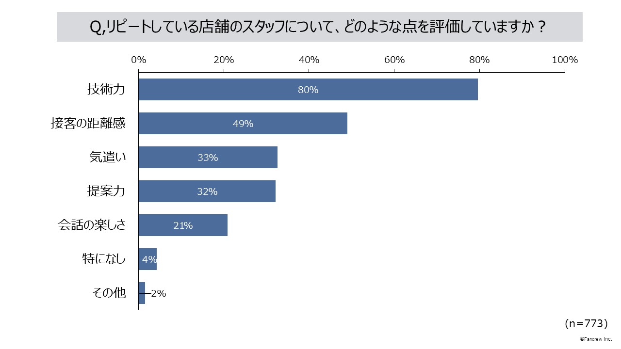 過去に美容室を「1回のみの利用で、その後リピートしなかった」経験がある方は82%にのぼりました。リピートしなかった最大の理由は「施術の仕上がり・効果」が51%と最多でしたが、「スタッフの接客態度・言葉遣い」や「店内の雰囲気・清潔感・設備」「価格設定」といった技術以外の要因を合算すると約半数に達し、技術力だけで顧客を繋ぎ止めることの難しさが浮き彫りとなりました。また、離脱した店舗からその後にアプローチを受けていないと回答した人は69%と、多くの店舗で離脱顧客へのフォローが手付かずとなっています。「クーポンの発行など」が45%と再来店へのアプローチとして効果的で、かつ、継続利用している店舗では「接客の距離感」や「気遣い」が高く評価されています。このことから、再来店へのきっかけ作りとしてクーポンの活用をし、その後の信頼関係の再構築がリピーター獲得へとつながります。
