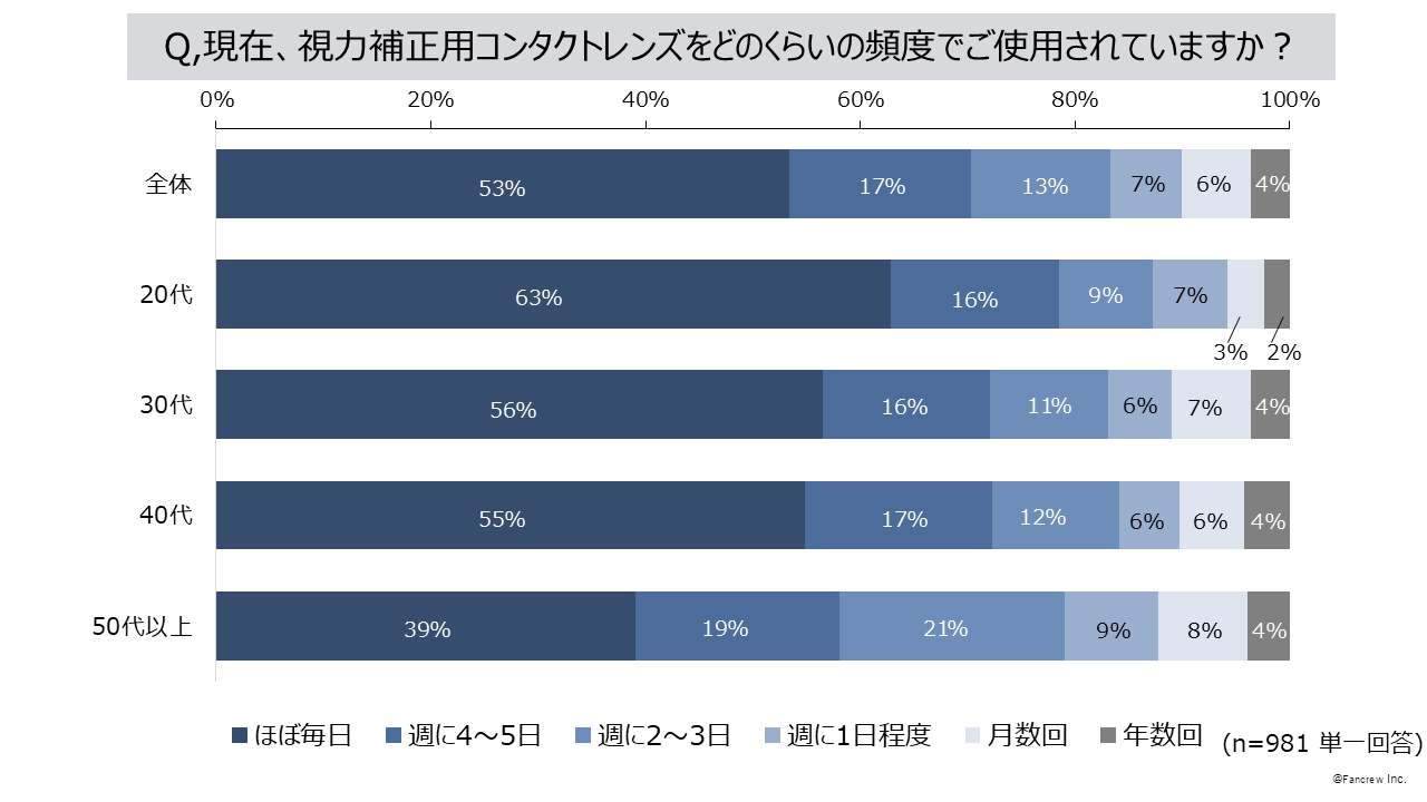 - 視力補正用コンタクトレンズを使っている方の使用頻度は「ほぼ毎日」53%
