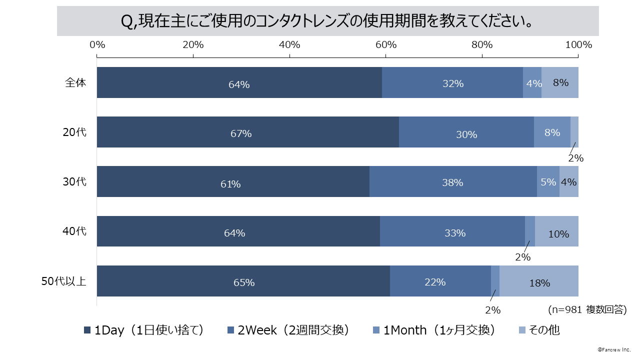 - 主に使用しているコンタクトレンズの使用期間は「1DAY(1日使い捨て)」64%