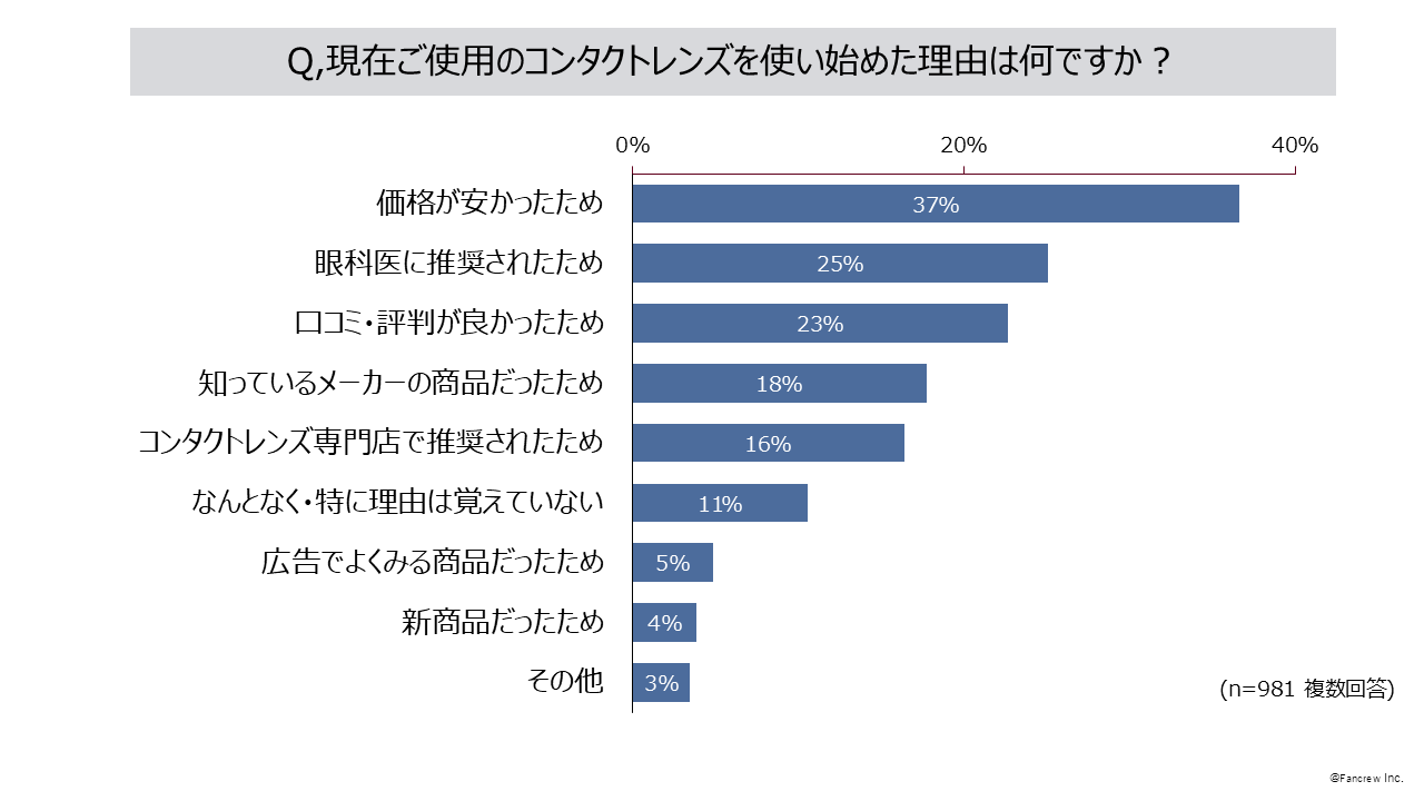 - 現在使用中のコンタクトレンズを使い始めた理由は「価格が安かったため」37%