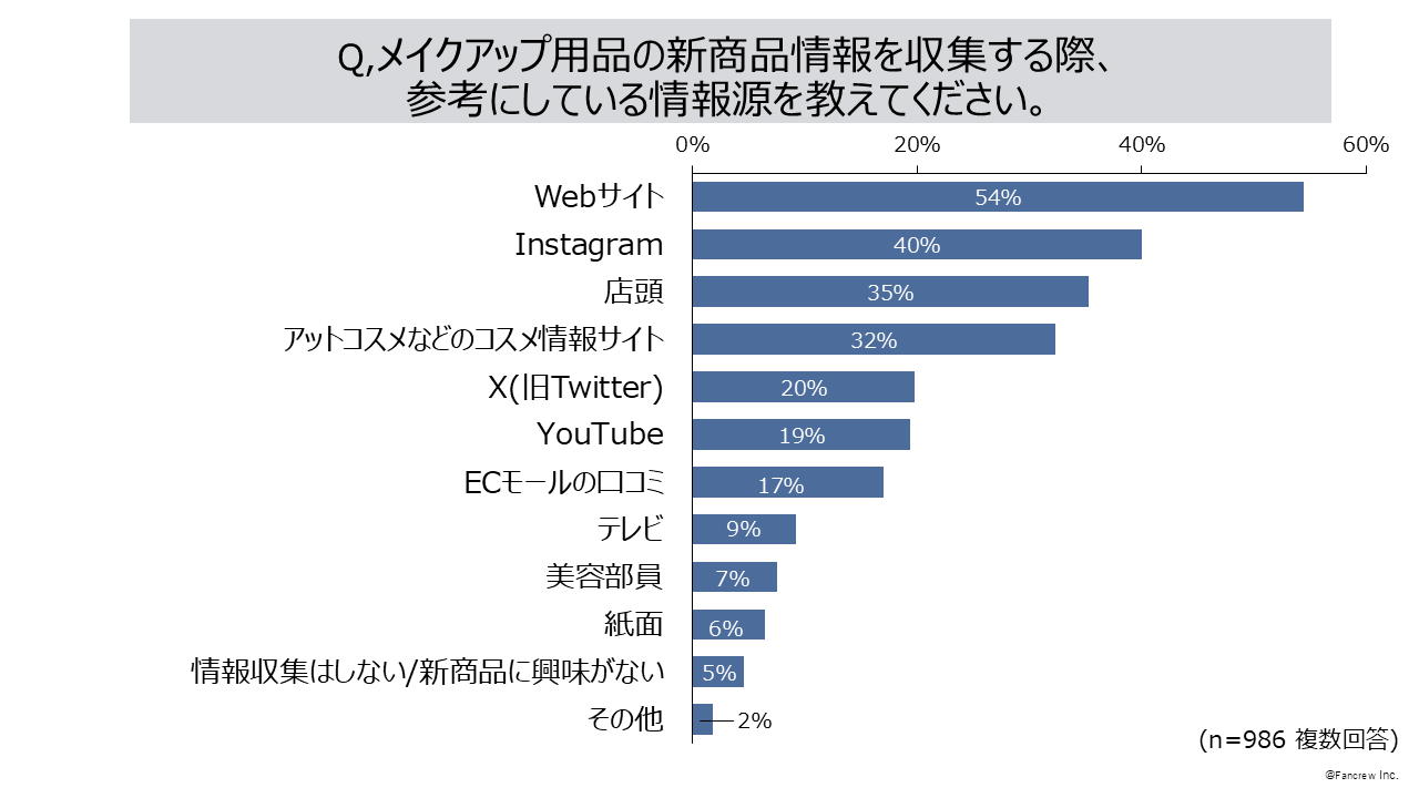 2. メイクアップ用品の新商品情報を収集する際に参考にしているのは「Webサイト」54%、「Instagram」40%