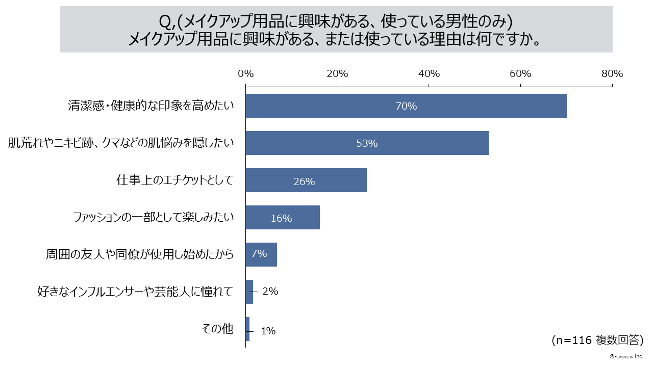 1.(男性のみ)「メイクアップ用品を使ってみたいと思う、または現在使っている」59%、理由は「清潔感・健康的な印象を高めたい」70%