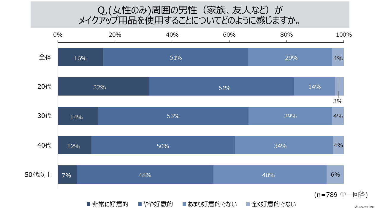 - (女性のみ)周囲の男性がメイクアップ用品を使用することに対して「非常に好意的」「好意的」67%