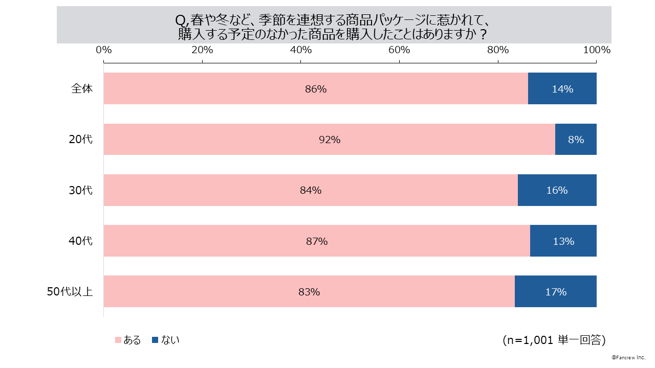 - 季節を連想する商品パッケージに惹かれて「購入予定のなかった商品を購入したことがある」86%