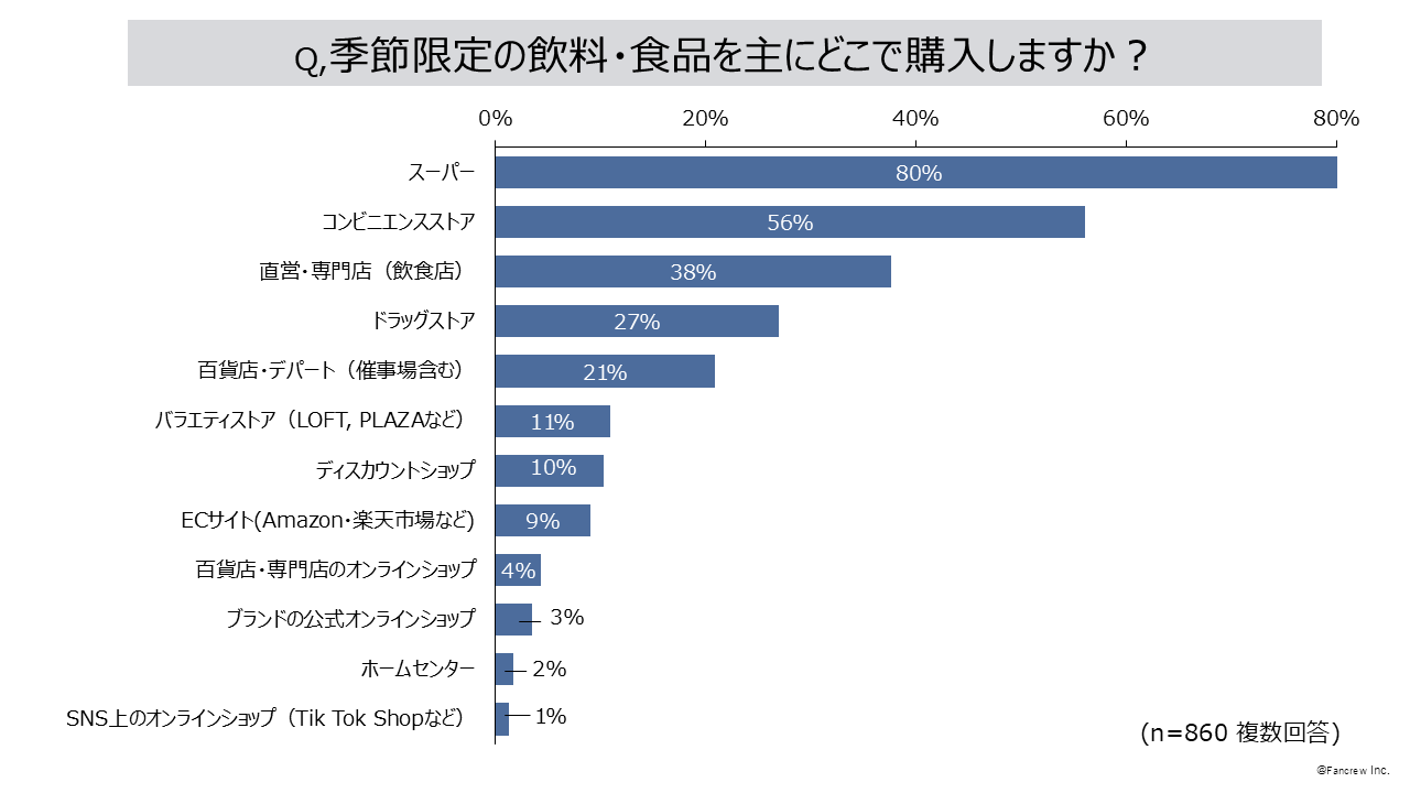 - 季節限定の飲料・食品の購入場所は「スーパー」と「コンビニエンスストア」