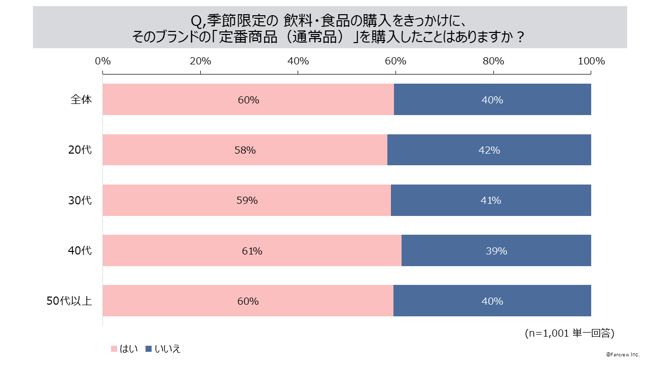 - 季節限定の飲料・食品をきっかけに、そのブランドの定番商品を「購入したことがある」60%