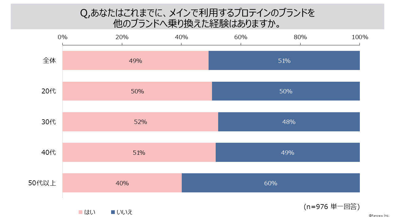 1.プロテインブランドの乗り換え経験が「ある」49%、乗り換えた理由は「味が気に入らない」
