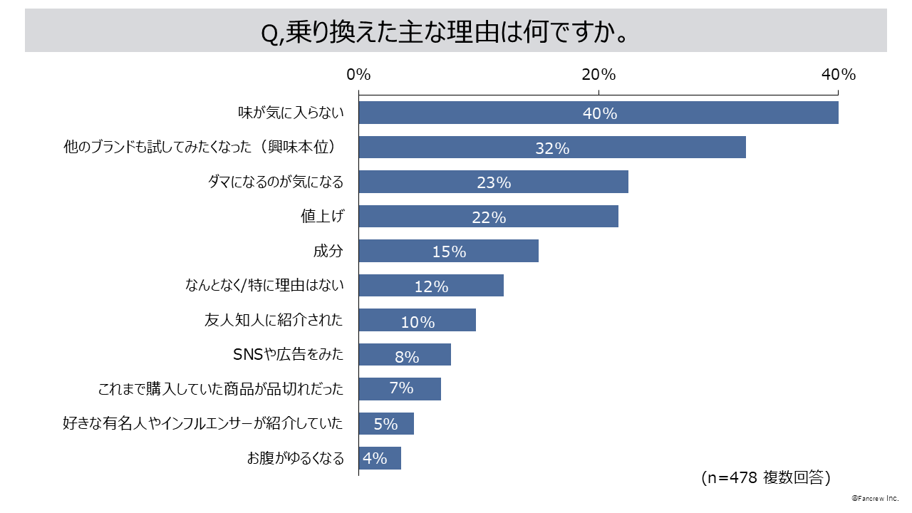 - プロテインブランドの乗り換え経験が「ある」49%、乗り換えた理由は「味が気に入らない」