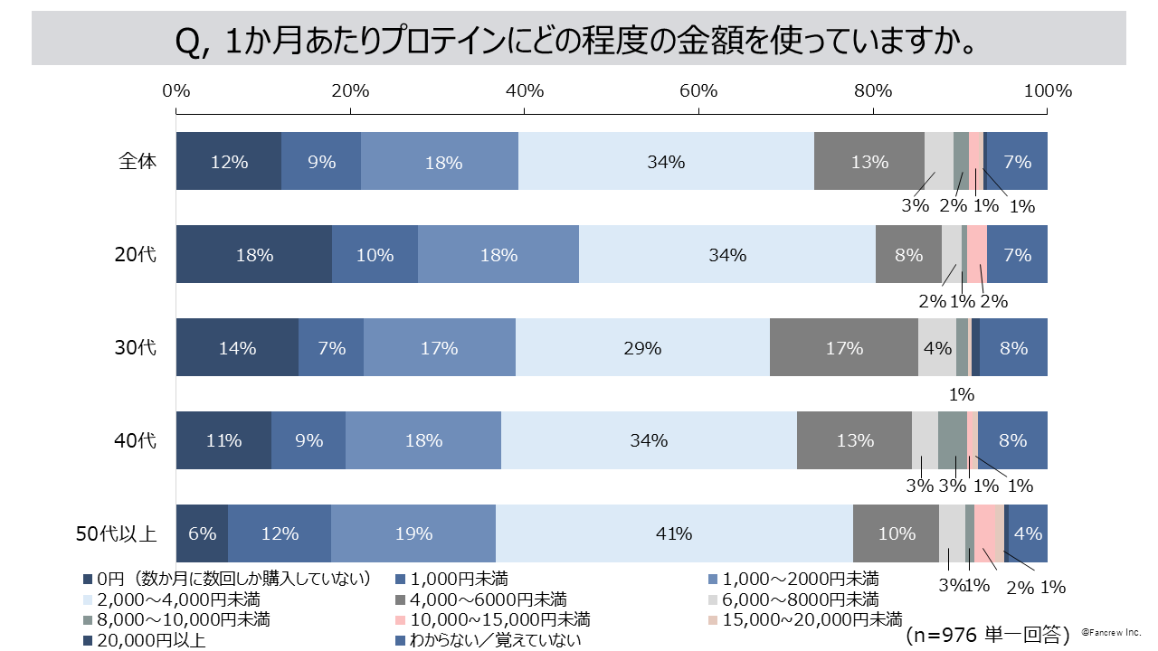 - 1か月あたりでプロテインに使う金額は「2,000~4,000円未満」が34%と最多