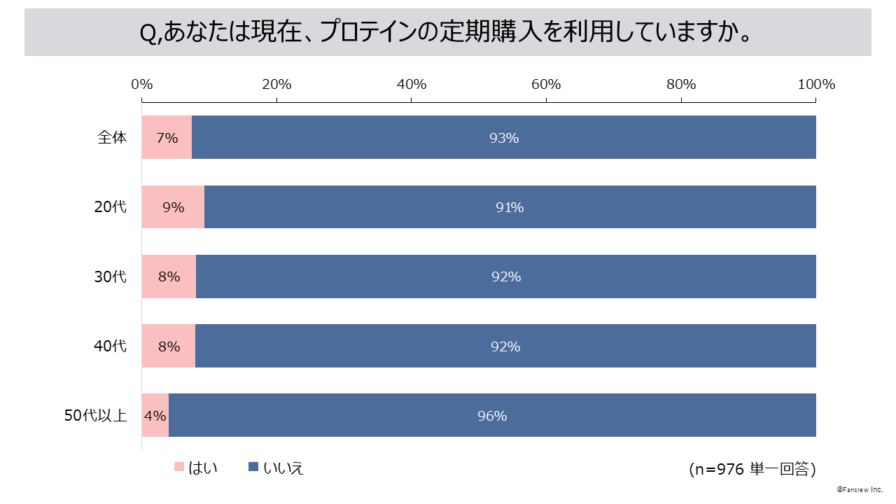 - プロテインの定期購入を「利用したことがない」93%、理由は「定期的な支払いや継続の約束をしたくない」54%