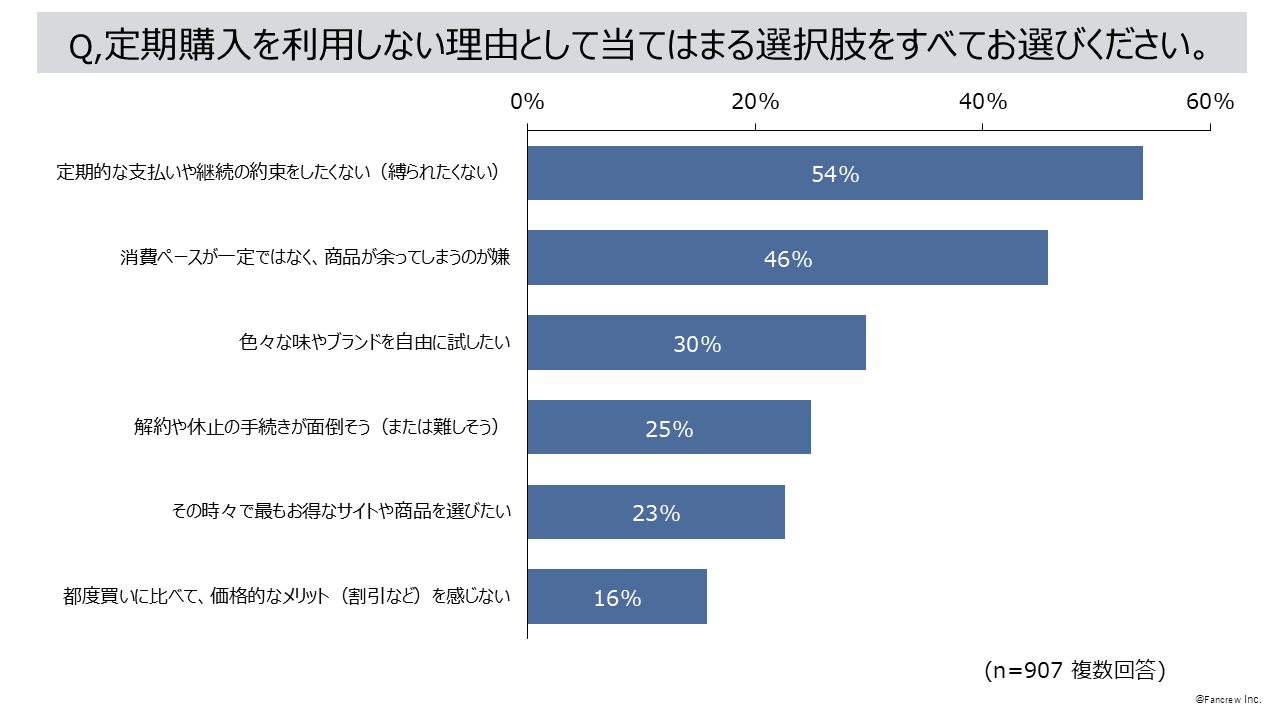 非利用理由は「定期的な支払いや継続の約束をしたくない」54%、次いで「消費ペースが一定ではなく、商品が余ってしまうのが嫌」46%でした。