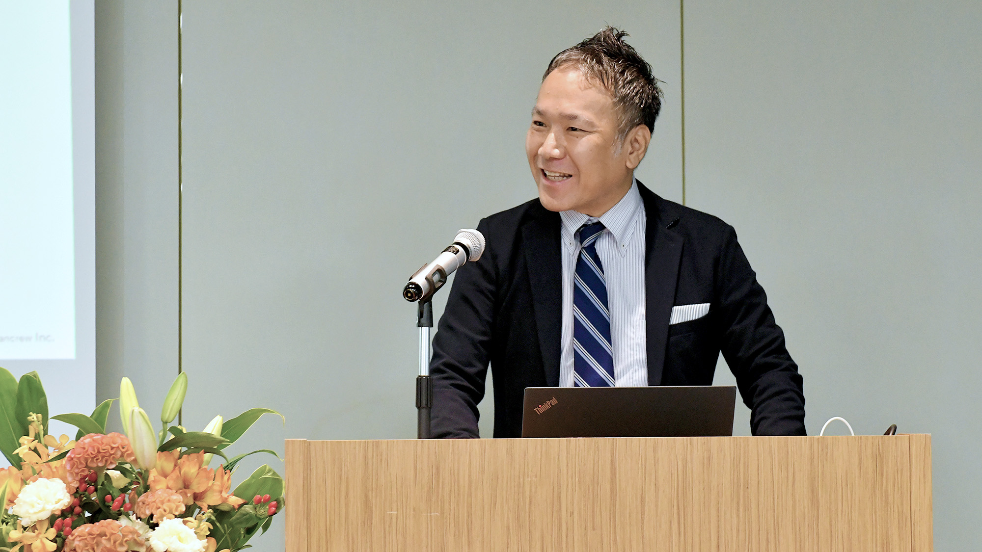 まずは代表の山口と取締役の永田より、内定者に向けて温かい祝辞が贈られました。山口代表からは、代表自身の社会人人生における挑戦と実体験について、永田取締役からは、「出会った方々を尊重して働くことの大切さ」についてお話をいただきました。